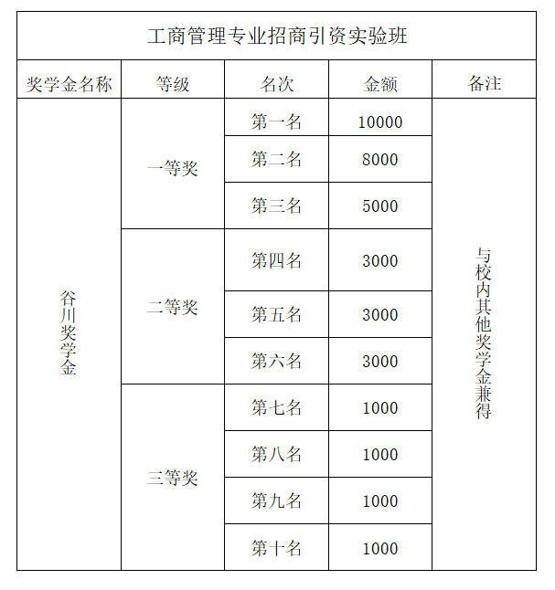 隨著近些年來國家投資體制的改革,招商引資工作成為各地區的重點,招商引資工作為各區域經濟發展、產業調整起到了決定性作用。經學校批準,管理學院依托已有的工商管理專業建設平臺,借助企業的師資資源及實訓基地進行校企合作,將于2020年面向全校 2019級各專業,招收工商管理專業(招商引資實驗班)的學生。招商引資實驗班培養期為三年,培養期間本實驗班不額外收取任何費用。學生錄取后成為我校工商管理專業(招商引資實驗班)大二的學生,招商引資實驗班以工商管理專業的必修課程為依托,開設由政企領導、行業專家講授的招商引資特色課程,提供見習實踐和實習機會,并對在培養期間表現優異的學生發放谷川獎學金(詳情見下)。