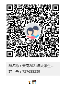 3、報名成功后申請加入QQ群:“天商2021年大學生英語競賽通知1群”,群號:730513270,若群1滿員,加群“天商2021年大學生英語競賽通知2群”,群號:727688239.進群后首先修改自己的備注名為班級+姓名,例如:計科1801:李明。請注意群內公告(特別注意準考證打印、初試、領取獲獎證書的通知),不要發布考試無關的信息。