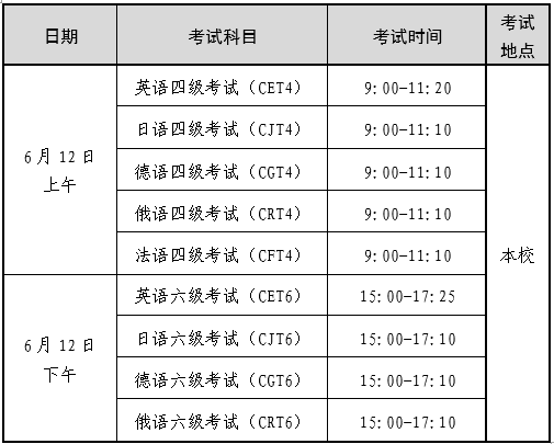 2021年上半年全國大學外語四、六級考試筆試(以下簡稱筆試)和2021年上半年全國大學英語四、六級考試口試(以下簡稱口試)將于2021年6月12日、5月22日和5月23日舉行。根據教育部考試中心和天津市教育招生考試院的要求,結合學校實際,現將本次考試報名的有關事項通知如下。