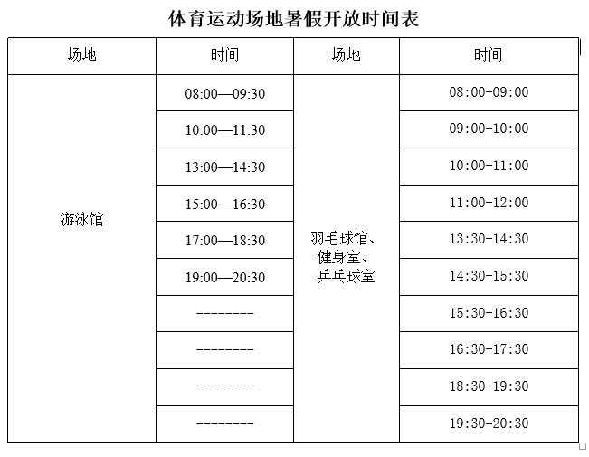 其他場(chǎng)地暑假進(jìn)行維修養(yǎng)護(hù),如遇場(chǎng)館維修等特殊情況,開(kāi)放時(shí)間另行通知。