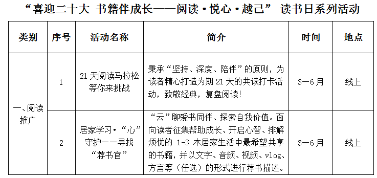 為了鼓勵廣大師生繼承勤學精神,弘揚優秀文化,暢讀書籍,滋養人生,充分發揮圖書館的學習和文化傳承功能,積極傳播社會主義先進文化,為落實學校“迎盛會、鑄忠誠、強擔當、創業績”主題學習宣傳教育實踐活動和“青春獻禮二十大奮斗擔當鑄忠誠強國有我新征程”主題宣傳教育活動部署,圖書館舉辦了“喜迎二十大書籍伴成長——閱讀·悅心·越己”系列讀書日活動。