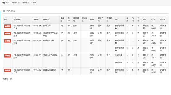 進入【退課】頁面,學生可對已選擇的課程進行刪除操作,注意不可刪除已置入的必修課。
