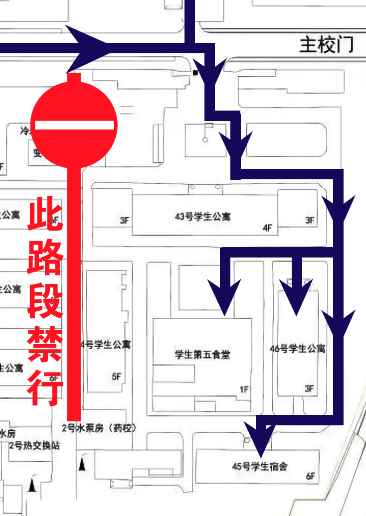 四、43號(hào)、44號(hào)西側(cè)道路全線封閉,去45號(hào)、46號(hào)樓,第五食堂請(qǐng)繞行43號(hào)前及東側(cè)。見示意圖:
