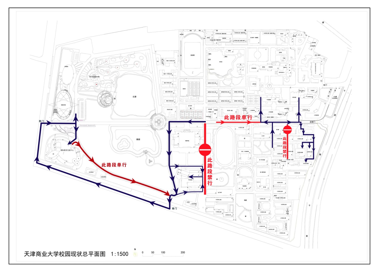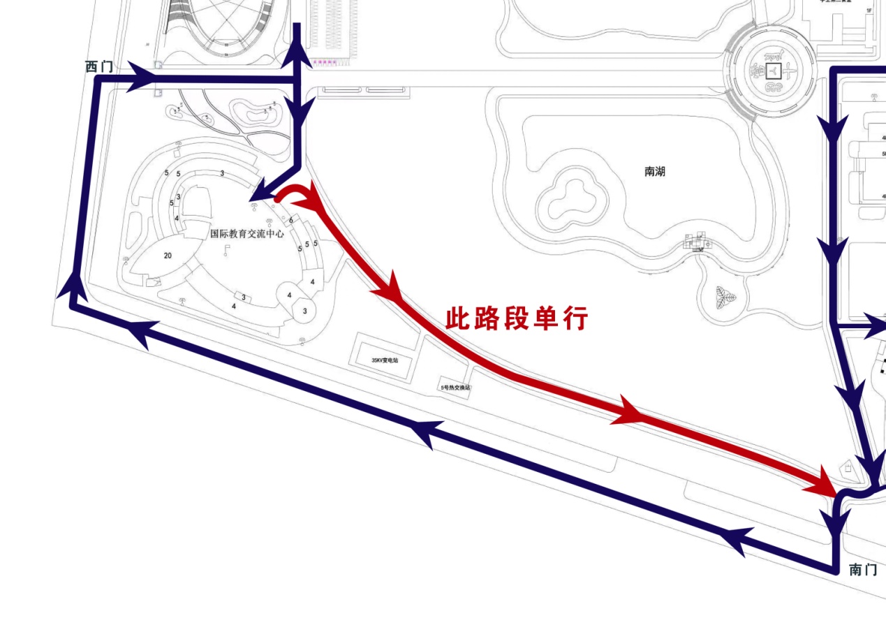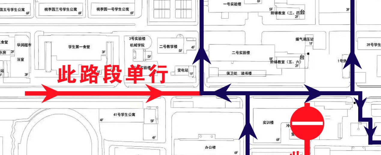 三、學(xué)生第一食堂后至辦公樓前道路實(shí)行單行,由南區(qū)去北區(qū)請(qǐng)走保衛(wèi)處門前、三號(hào)教學(xué)樓西側(cè)道路。見示意圖: