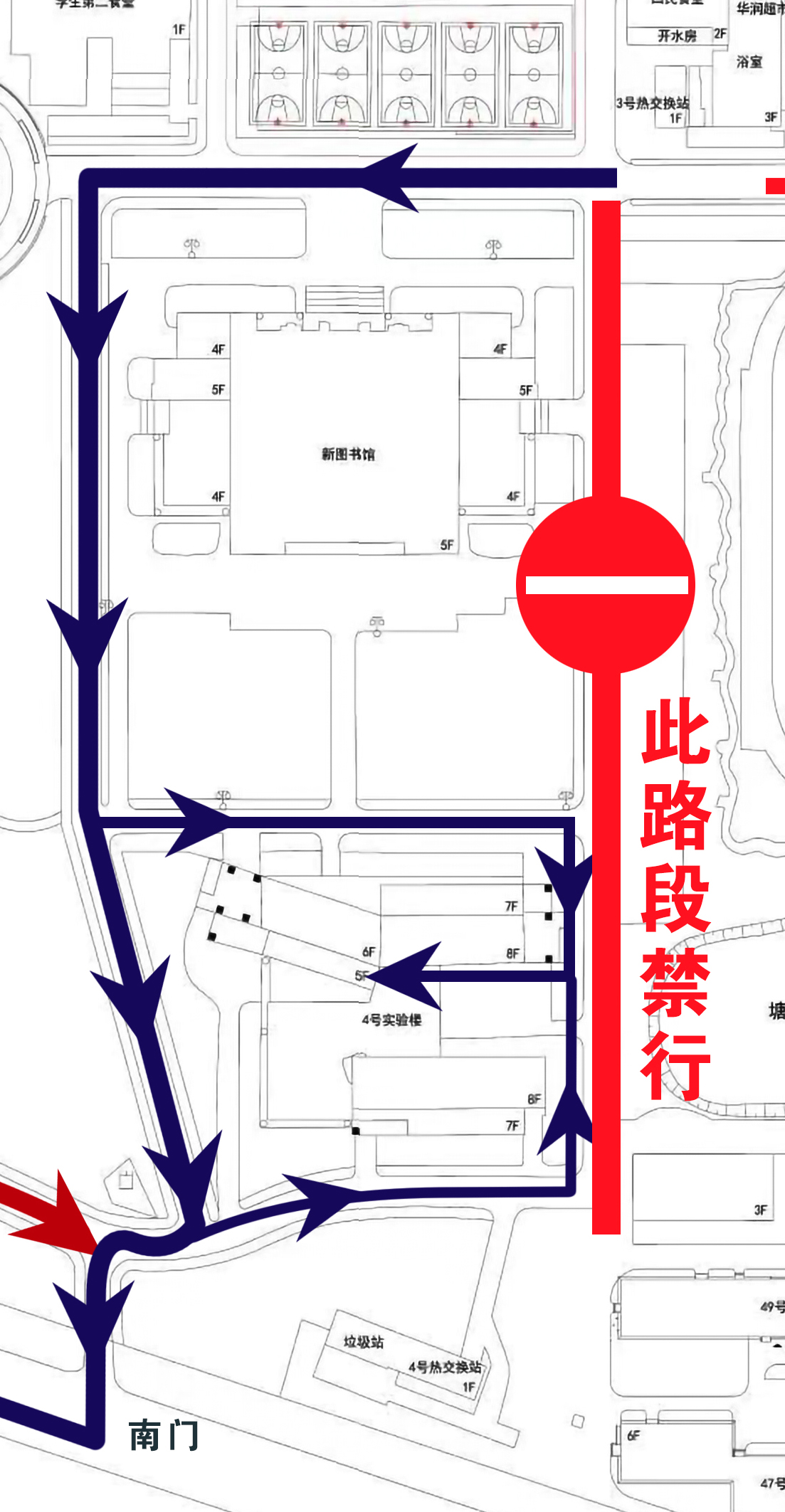 二、圖書館、4號(hào)實(shí)驗(yàn)樓東側(cè)道路全線封閉。去4號(hào)實(shí)驗(yàn)樓、南門請(qǐng)走圖書館、4號(hào)實(shí)驗(yàn)樓西側(cè)道路,進(jìn)4號(hào)實(shí)驗(yàn)樓由兩側(cè)側(cè)門進(jìn)樓內(nèi)。見示意圖:
