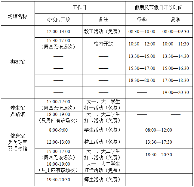 備注:游泳館夏季時間5月1日至9月30日;游泳館冬季時間10月1日至4月30日;學生打卡活動從教學周第二周開始。