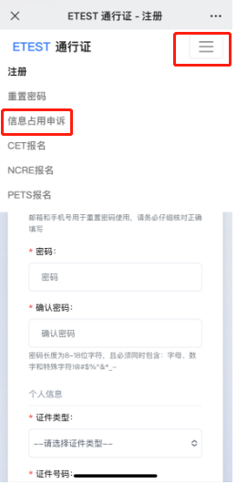 5.如考生發現個人信息被占用,點擊“信息占用申訴”,請盡早完成手持證件照上傳核驗工作。