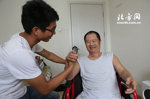 2012 年暑期開學,他拿著從親戚那里借來的錢在學院的附近租了一間房子方便照顧繼父。他每天早早起床,然后給繼父穿衣服、擦臉、刮胡子、做早飯,把繼父抱到輪椅里以后,看著繼父吃完早飯,再把電視打開,這才能出門去上課。下課后,他無暇與同學交流娛樂,他匆匆趕到家里,為繼父清理衛生、做飯。節假日里,在別人休閑、旅游、逛街的時候,他還要外出打工,他曾做過飯店服務員、賣過保險、打過地攤、發過廣告,想方設法掙點錢貼補家用,就這樣他悉心的照顧著他的繼父。