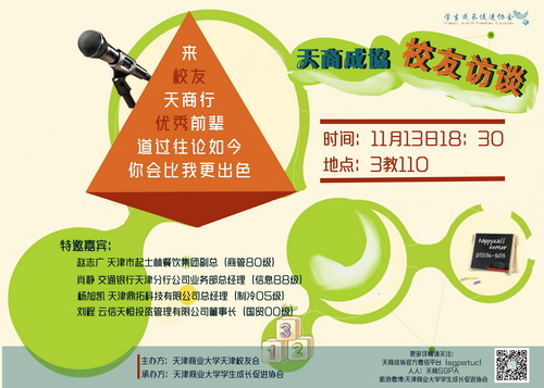 由天津商業大學天津校友會主辦,天津商業大學學生成長促進協會承辦的校友訪談交流會將于11 月13 日 18:30 三教 110 舉行,訪談交流會邀請交通銀行天津分行公司業務部總經理(信息 88 級)肖靜、云信天恒(天津)投資管理有限公司董事長(國貿 00 級)劉程、天津鼎拓科技有限公司總經理(制冷 05 級)楊旭凱、天津市起士林餐飲集團總經理(商管 80 級)趙志廣,歡迎廣大同學參加。