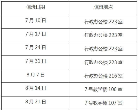 一、7月10日至8月21日期間,每周周三上午8:30至12:00安排專人值班。8月28日起恢復正常上班時間。具體日期如下: