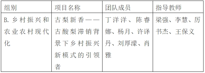 根據我校2024年“挑戰杯”大學生創業計劃競賽校賽組織發動情況以及項目在市賽中的獲獎情況,市賽組委會擬增加《古梨新香——古酸梨滯銷背景下鄉村振興新模式的引領者》項目參加全國競賽評審。現將項目信息予以公示: