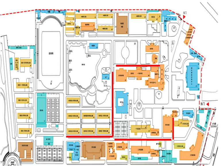 4.四號教學(xué)樓、一號教學(xué)樓北側(cè)直至學(xué)術(shù)交流中心。