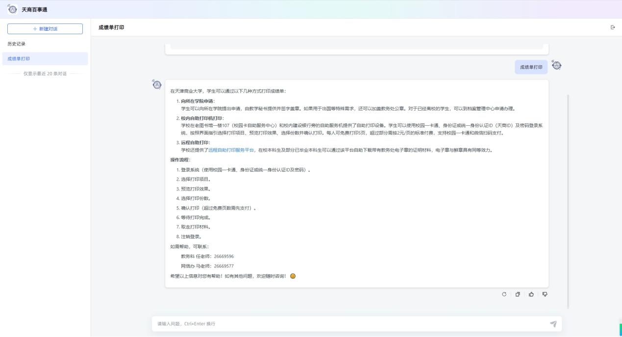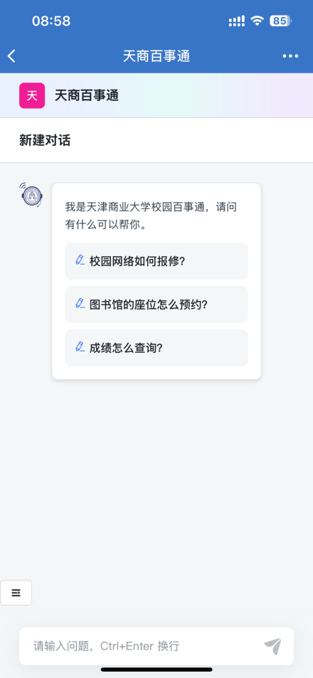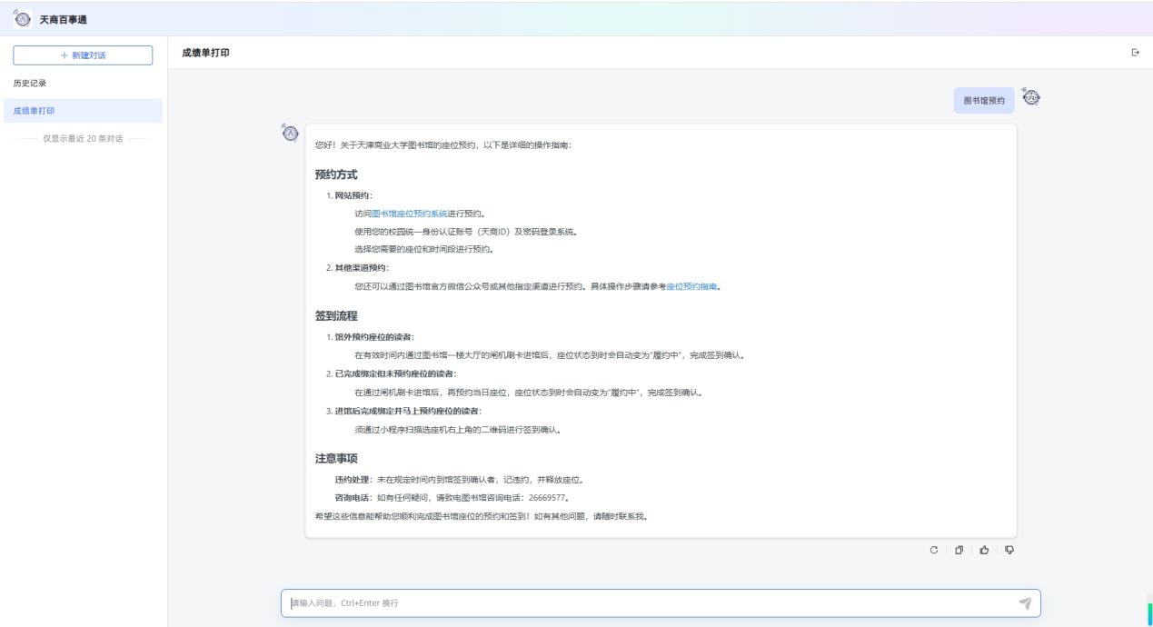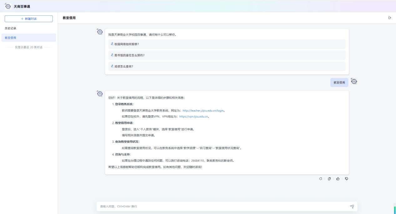 為深入貫徹落實學校第三次黨員代表大會提出的“數智賦能戰略”要求,全面推進學校教育數字化轉型和高質量發展。近期學?;贒eepSeek-R1/V3(671B)大語言模型技術,依托本地化智能體平臺創建學校專有知識庫,開發了“天商百事通”應用。該應用提供了學校管理規范、辦事流程、信息查詢等場景的智能問答服務,旨在為師生提供便捷化、精準化、智能化的校園服務。
