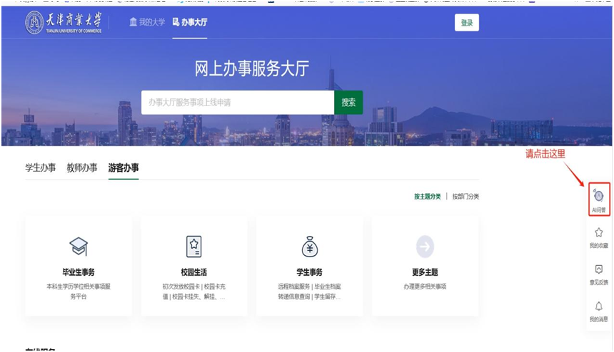 目前“天商百事通”已成功對接到企業微信和網上辦事服務大廳中,師生可以通過上述兩種途徑進行訪問使用,具體使用方式如下:
