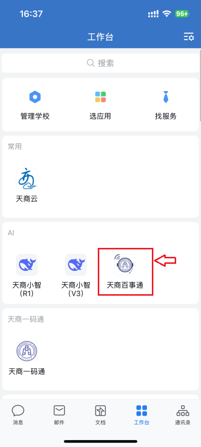 1.移動端訪問方式:點擊“企業微信”-“工作臺”-“天商百事通”,如下圖所示: