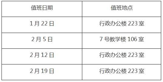 一、1月20日至2月25日期間,每周周三上午8:30至12:00安排專人值班。2月26日起恢復(fù)正常上班時(shí)間。具體日期如下: