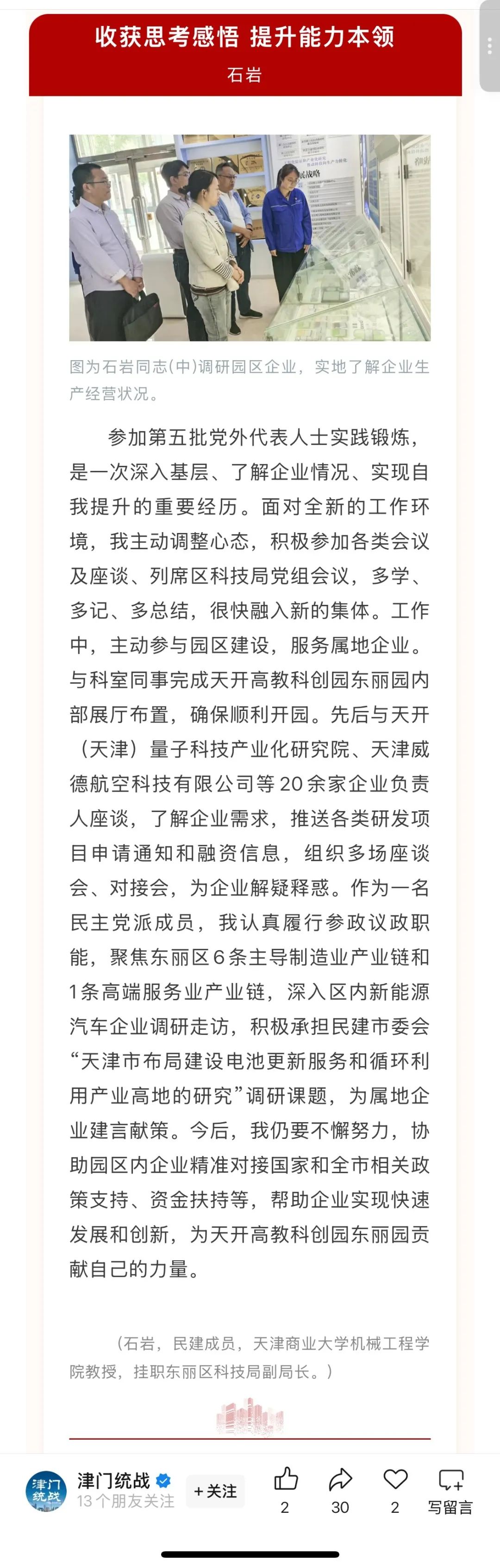 日前,“津門統(tǒng)戰(zhàn)”微信公眾號報道了我校機(jī)械工程學(xué)院黨外掛職干部石巖教授實踐鍛煉風(fēng)采。2024年7月,機(jī)械工程學(xué)院石巖教授作為第五批黨外代表人士中的一員,赴天津市東麗區(qū)科技局掛職鍛煉,把自身專業(yè)所長融入經(jīng)濟(jì)社會發(fā)展所需,以實際行動助力城市發(fā)展。