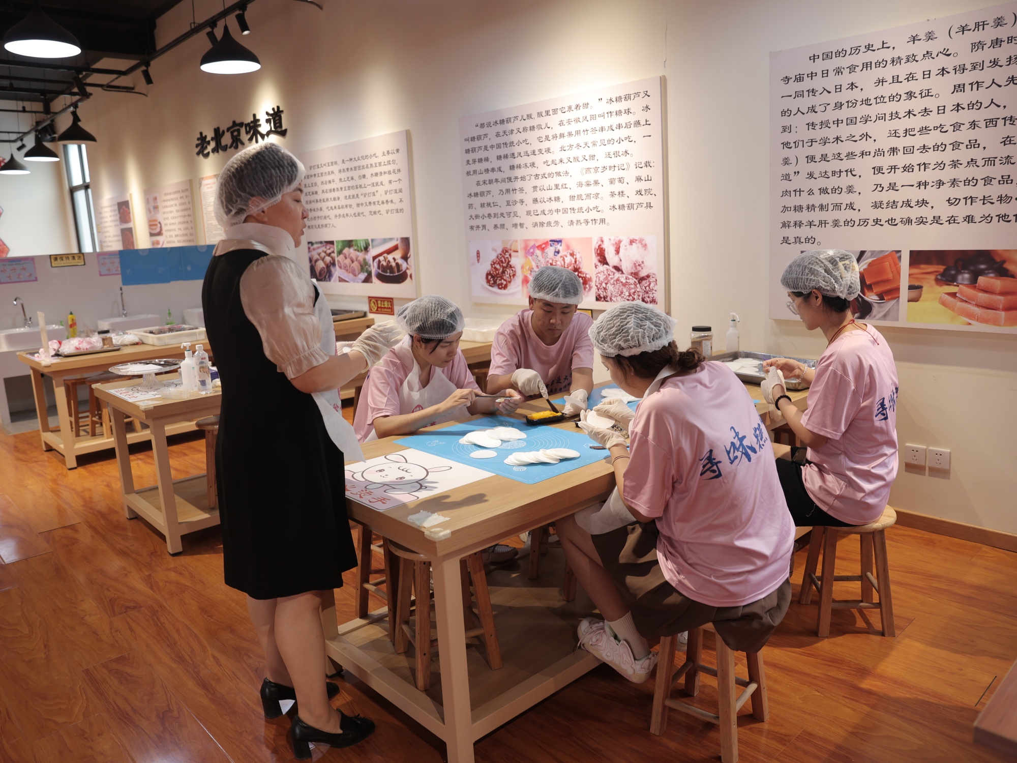 過程中,實踐隊走進位于天津市寶坻區的桂順齋食品有限公司,與桂順齋糕點技藝大師——王全喜老師傅進行深度交流探討,實地拍攝了老師傅現場制作桃花酥、燈籠酥、佛手酥的過程;在唐山豐潤祥順齋棋子燒餅非遺文化體驗館,大家聆聽棋子燒餅非遺傳承人谷小光介紹祥順齋發展史及棋子燒餅的傳承歷史,并現場觀摩了制作技藝;在北京紅螺食品有限公司走訪期間,參觀了公司內的果脯博物館,親手體驗制作驢打滾和茯苓夾餅等;在貴陽廣寒宮點心坊,隊員們聆聽負責人講述傳承故事,參觀各類點心模具,了解廣寒宮糕點制作非遺技藝;在甘肅蘭州天生園食品有限公司,隊員們實地探訪了銷售店面和生產車間,深入了解天生園創立至今的歷程和背后的匠人情結。