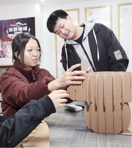 11月20日,天津商業大學“夢無界·創非凡”——天商微渡創新創業體驗周活動 拉開帷幕。大學生們在活動中體驗創新創業項目中的前沿科技、傳統手工藝制作等 內容,體會現代科技與傳統文化的融合,感受創新創業項目的魅力。圖為大學生體驗 “讓瓦楞紙走進生活”項目。