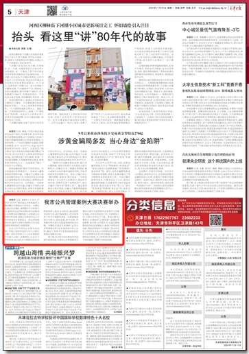 11月25日,《天津日報》報道我校舉辦天津市公共管理案例大賽決賽。大賽旨在通過社會調研、案例撰寫與分析等方式,提高學生運用相關理論和方法解決公共管理實際問題的能力,對促進公共管理學科發展、提高公共管理專業人才培養質量具有重要意義。經過多輪激烈比拼,南開大學和天津財經大學分別獲得本科組和碩士組特等獎。