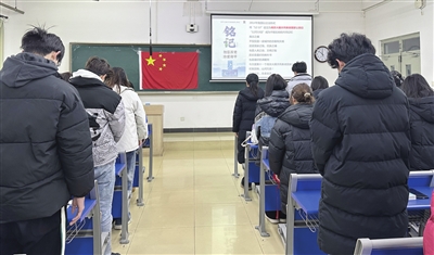 天津農學院舉行國家公祭日主題班會,師生們為南京大屠殺遇難者默哀。 通訊員 任怡潔 本報記者 姜寶成 攝