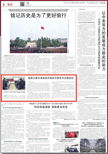 12月14日,《天津日報》報道我校舉辦“勿忘國恥·吾輩自強”國家公祭日主題升旗儀式。天津商業大學舉行“勿忘國恥·吾輩自強”國家公祭日主題升旗儀式,百余名師生代表會聚于學校操場,齊唱國歌、肅立默哀,表達對祖國的無限熱愛和對逝者的哀悼之情。