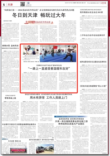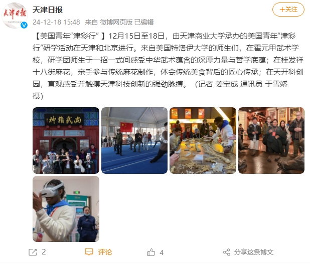 12月15日至18日,作為“美國青年使者交流學(xué)習(xí)計(jì)劃”的一部分,“津彩行”天津商業(yè)大學(xué)美國青年使者來華交流研修活動(dòng)開展,來自美國阿拉巴馬州的高校師生團(tuán)先后在天津、北京“沉浸式”感知中國文化、感受中華文化之美,體驗(yàn)中國傳統(tǒng)文化與現(xiàn)代科技的魅力?!短旖蛉請?bào)》、津云客戶端等媒體分別進(jìn)行了專題報(bào)道。