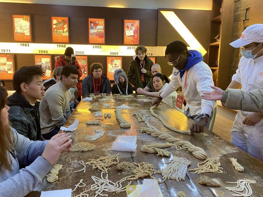 百年老字號企業(yè)“桂發(fā)祥”十八街麻花文化館則是以“食”會友,館內(nèi)誘人的美食展品、詳實的麻花制作工藝令美國青年們目不暇接。在親身體驗麻花制作環(huán)節(jié),交流團成員從最初的生疏逐漸變得得心應手,當看到自己親手搓制出的麻花形狀,喜悅與成就感溢于言表,不時發(fā)出陣陣歡呼。