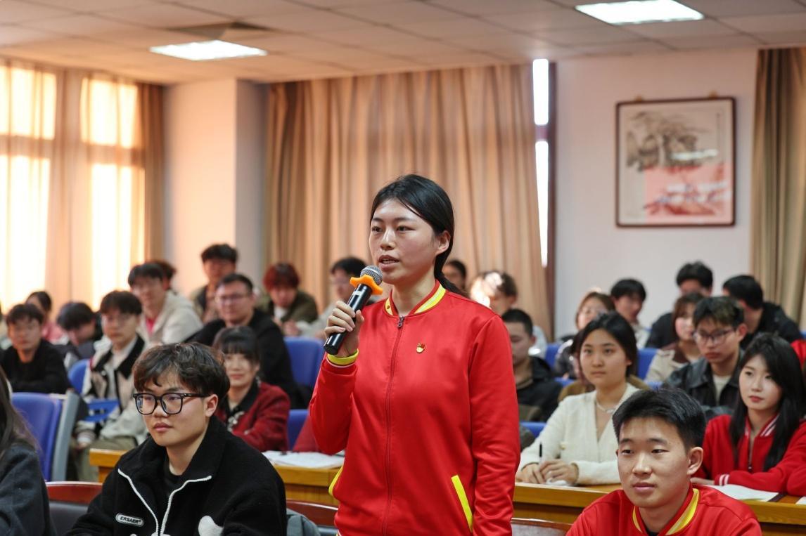 張亞帶領同學們回顧了新中國式現代化進程的歷史脈絡和理論邏輯,強調要深刻領悟全面建成社會主義現代化強國的戰略部署和世界意義。他指出,要深刻認識建設教育強國在強國建設中的重要地位和作用,并對《教育強國建設規劃綱要(2024-2035)》進行了解讀。張亞表示,學校剛剛閉幕的第三次黨員代表大會作出了工作部署,明確了未來五年發展的目標任務,是落實教育大會精神和《教育強國建設規劃綱要(2024-2035)》的具體行動,全校師生要同心協力為高質量推進建設特色鮮明高水平商業大學而不懈奮斗。并就“育人、隊伍、科研、學科、改革、管理、文化、資源、開放、特色、數智、黨建”12個工作著力點與學生做了交流。