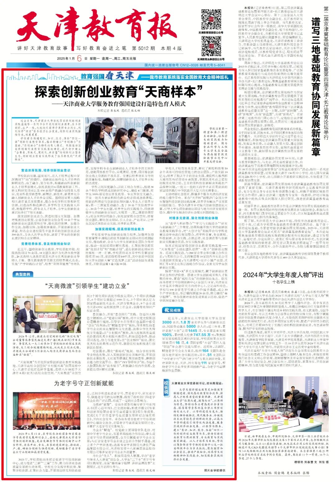 1月6日,《天津教育報》報道我校服務教育強國建設打造特色育人模式。學校著力構建意識、知識、能力、體驗“四位一體”創新創業教育體系,推動構建以“專創融合”為基礎、“思創融合”為特色的育人模式。積極推動國家級創新創業教育實踐基地建設,現已初步建立“全要素、開放式、便利化、共享型”的創新創業服務生態,創新創業教育實踐形成了獨具特色的“天商樣本”。同期,學習強國、《天津教育報》頭條號也進行了轉載報道。