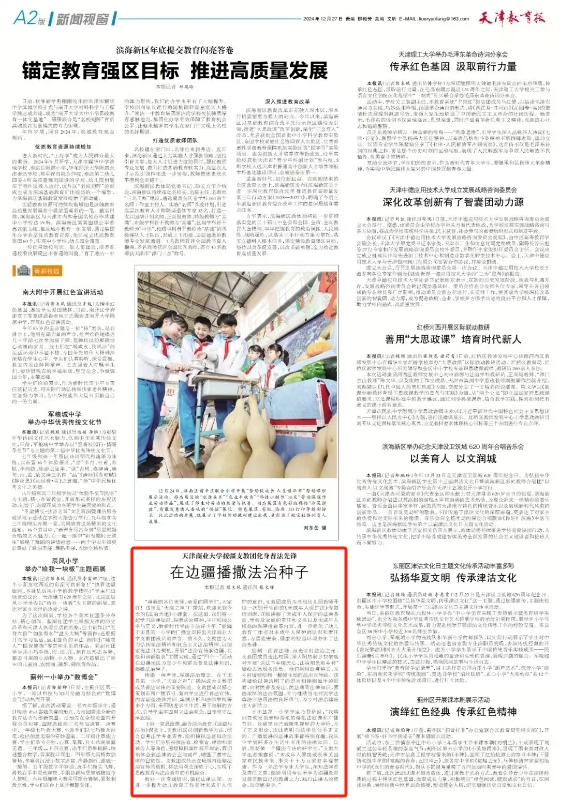 12月27日,《天津教育報》報道我校援疆支教團先進事跡。支教團為大力弘揚憲法精神和社會主義法治精神,以國家憲法日為契機,開展“法治宣傳潤邊疆,共繪和諧新篇章”主題實踐,通過“四個一”活動 在邊疆地區為青少年和群眾普及法律知識, 播撒法治種子。