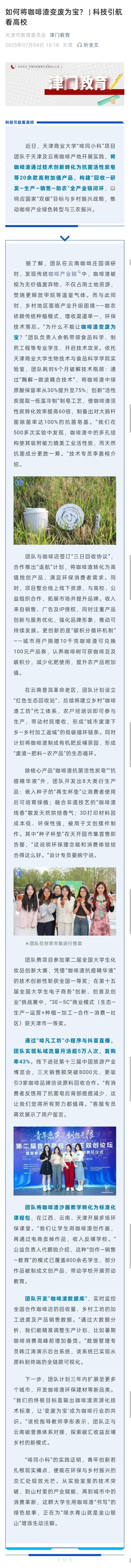 7月4日,津門教育微信公眾號報道學?!胺韧】啤表椖繄F隊實踐活動。近日,天津商業大學“啡同小科”項目團隊于天津及云南咖啡產地開展實踐,將咖啡渣通過技術創新轉化為抗菌活性炭皂等20余款高附加值產品,構建“回收—研發—生產—銷售—助農”全產業鏈閉環,以響應國家“雙碳”目標與鄉村振興戰略,推動咖啡產業綠色轉型與三農振興。