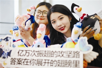天津財經大學藝術學院畢業生劉玥彤(右)是校園“鴨當斯密”IP的第二代接力者,在王紫藤學姐(左)的帶領下,她做出了一系列衍生形象,并單獨設計,給“鴨當斯密”布偶換上畢業裝,讓一個靈感來自校園小鴨子的設計變得光彩照人,一經推出就受到廣大師生的喜愛。