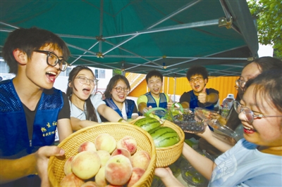 天津職業大學畢業生在學校組織的農產品推介活動上,為天津農產品代言。據悉,“助農‘益起來’”天津職業大學學生社區農產品市集活動是天津職業大學開展的第二場薊州區農產品推介活動,是為實現畢業生回饋學校美好心愿而采取的暖心舉措。
