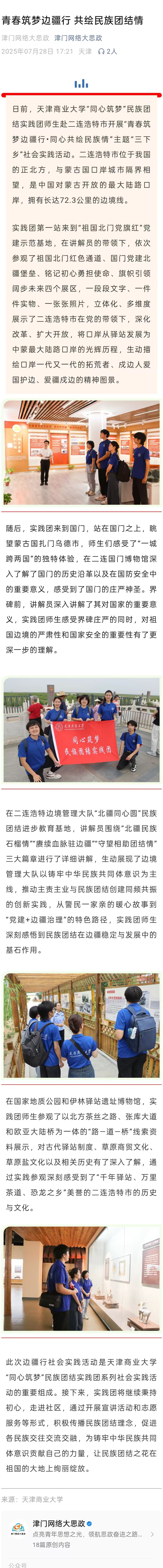 7月28日,津門網(wǎng)絡(luò)大思政微信公眾號(hào)報(bào)道學(xué)校“同心筑夢(mèng)”民族團(tuán)結(jié)實(shí)踐團(tuán)師生赴二連浩特市開展“青春筑夢(mèng)邊疆行?同心共繪民族情”主題“三下鄉(xiāng)”社會(huì)實(shí)踐活動(dòng)。