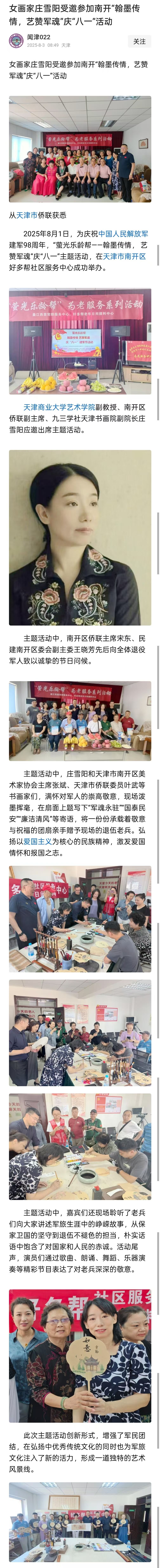 近日,今日頭條號、南開婦聯微信公眾號報道我校藝術學院教師莊雪陽受邀參加南開“翰墨傳情,藝贊軍魂”慶“八一”活動。