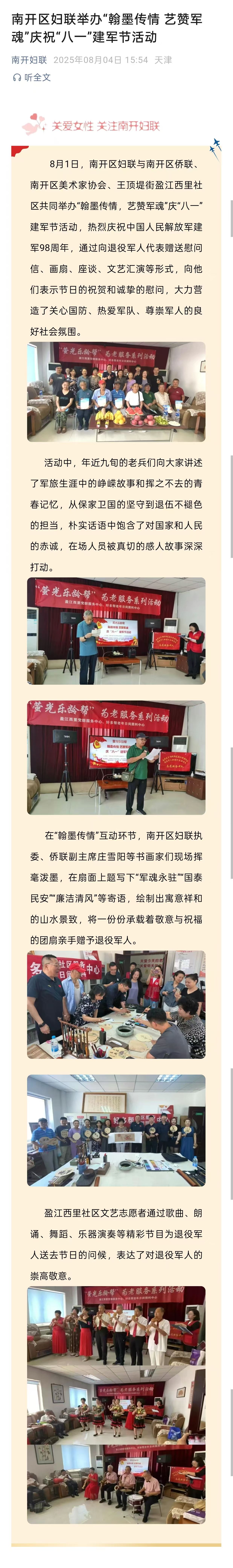 今日頭條號、南開婦聯微信公眾號報道我校藝術學院教師莊雪陽受邀參加南開“翰墨傳情,藝贊軍魂”慶“八一”活動