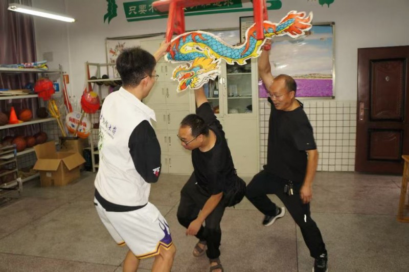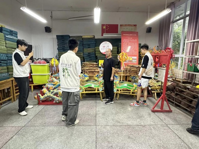 在南川區石溪鎮中心校小學,團隊成員見到了非遺民俗舞蹈“板凳龍”的傳承人夏傳紅老師。這項起源于1876年的重慶市非物質文化遺產,正以充滿朝氣的姿態在校園中煥發新生。穿過掛滿板凳龍舞各種獎項的展示長廊,團隊來到非遺陳列室。各式各樣的板凳龍道具陳列其間:竹篾與稻草編織的傳統草龍質樸粗獷,泡沫填充的練習龍輕便靈巧,而專為小學生設計的塑料小板凳龍僅有巴掌大小,紅黃相間的鱗片在燈光下熠熠生輝。實踐隊員們在訓練場親身體驗了這項古老技藝。個人舞講究即興發揮,隊員舉起板凳舞起來便覺重心不穩,踉蹌幾步才勉強穩住;最難的三人穿插舞步中,隊員反手穿凳時屢屢卡頓,險些摔倒。“板凳龍舞需要千百次練習,非遺傳承的精髓就在‘熟能生巧’四字。”夏傳紅扶正隊員手中的龍具,娓娓道來。