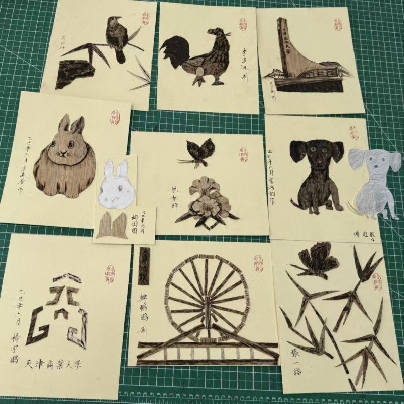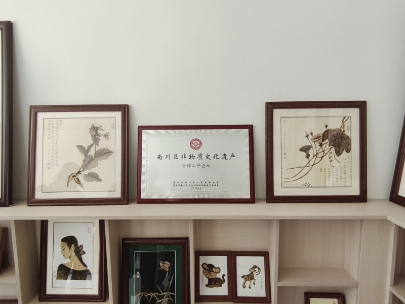 “我的理念就是尊崇自然,筍殼畫作品里很少有染色的,基本上都是保持筍殼天然的顏色。”在南川區金山鎮,胡德厚老師用短短一句話向團隊介紹了他的創作心境。筍殼畫的制作過程繁瑣,挑選好的筍殼需剝皮去毛,篩選厚度適宜,顏色均勻的筍殼,在描繪刻畫進行粘貼,最后烙鐵修飾細節,題字鑲框,實踐隊根據老師指導一步步完成筍殼畫創作。“用天然的紋理,天然的顏色變化,根據事物天然的生長方向順著來用它。”按著老師的理念試了試,團隊成員不禁發現刻刀邊省力了,更驚覺人力修飾融合天然之美的奧妙。