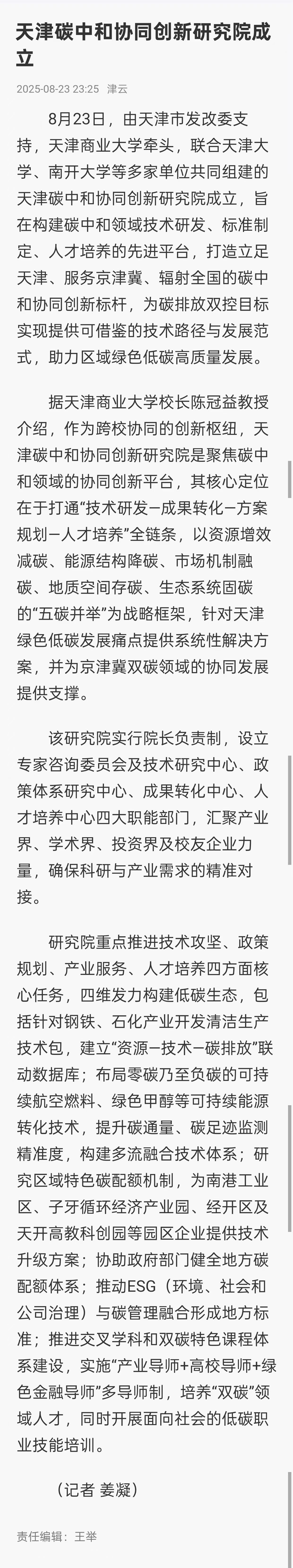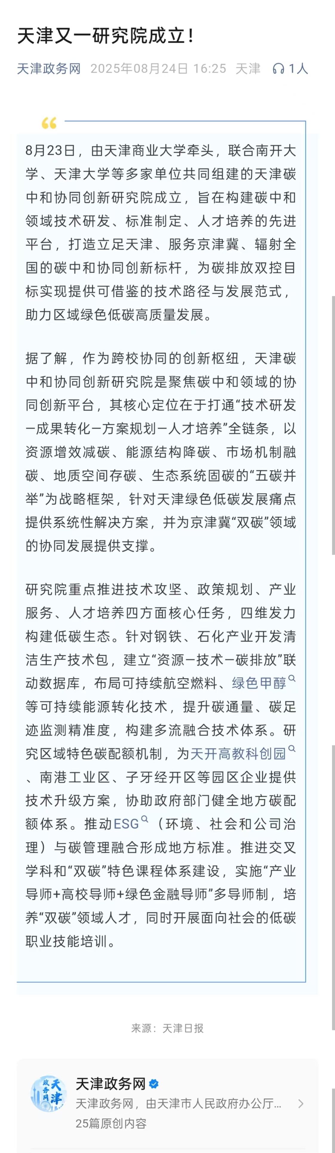 8月24日,《天津日報》、天津政務網微信公眾號、津云客戶端報道我校牽頭的天津碳中和協同創新研究院成立。