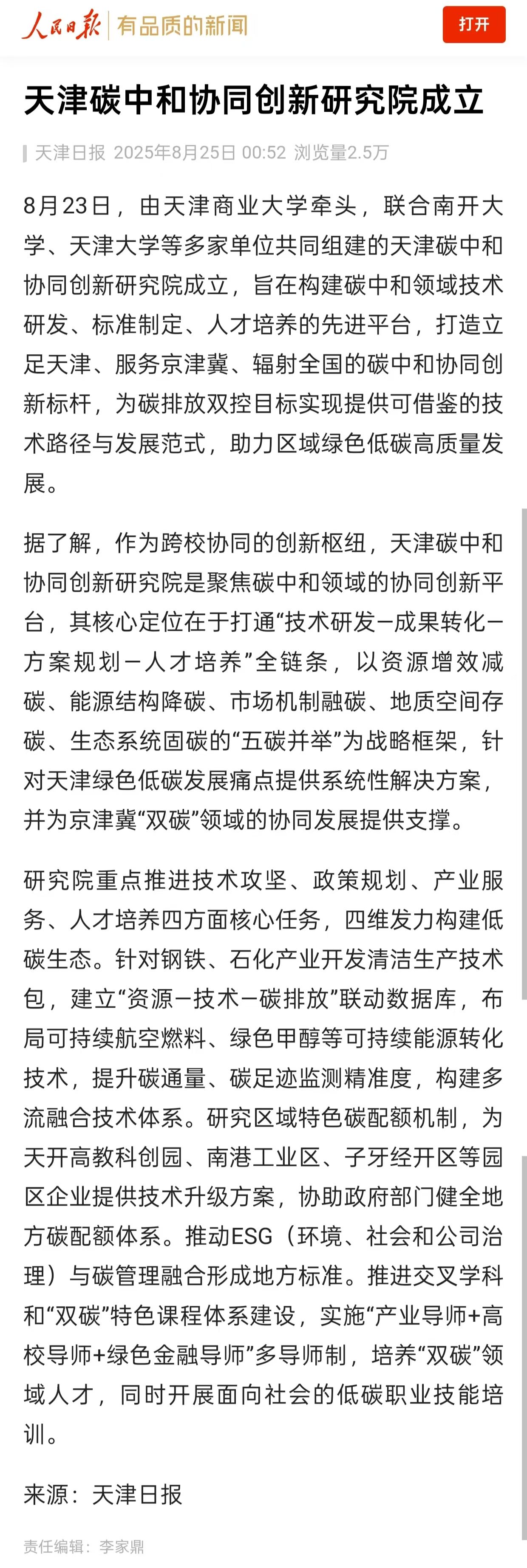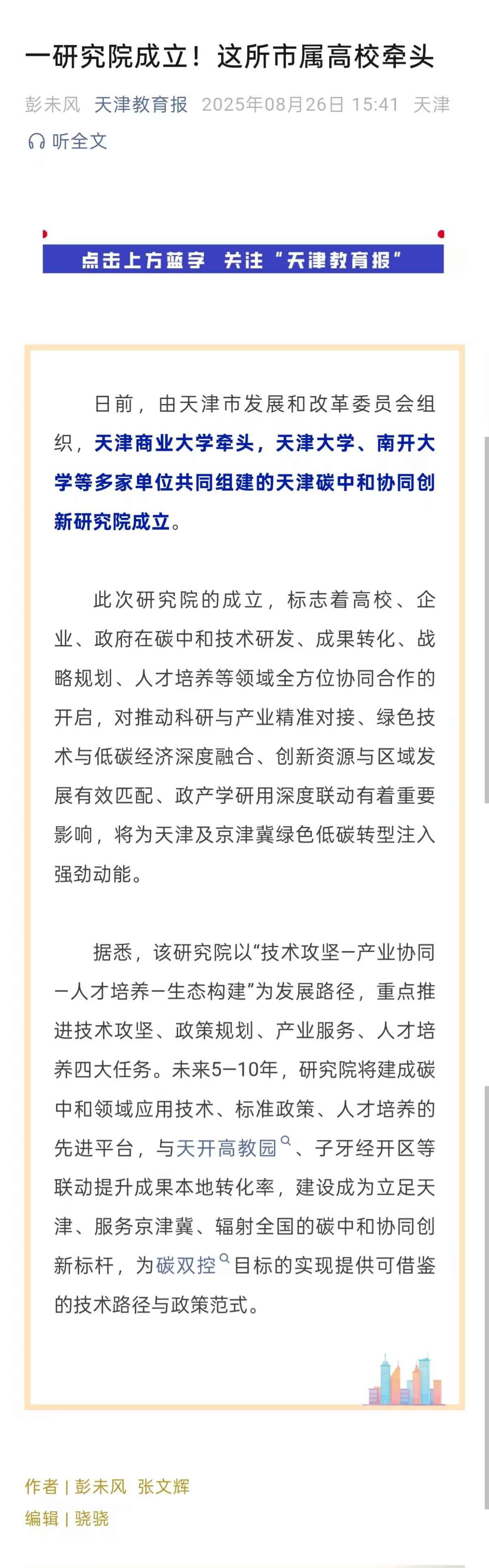 人民日報客戶端、天津教育報今日頭條號報道天津碳中和協(xié)同創(chuàng)新研究院成立