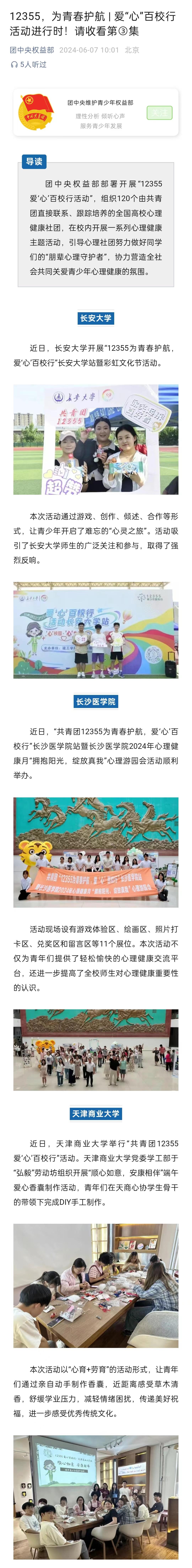 6月7日,團中央權益部微信公眾號報道我校開展系列心理健康教育活動。近日,天津商業大學舉行“共青團12355愛‘心’百校行”活動。天津商業大學黨委學工部于“弘毅”勞動坊組織開展“順心如意,安康相伴”端午愛心香囊制作活動,青年們在天商心協學生骨干的帶領下完成DIY手工制作。