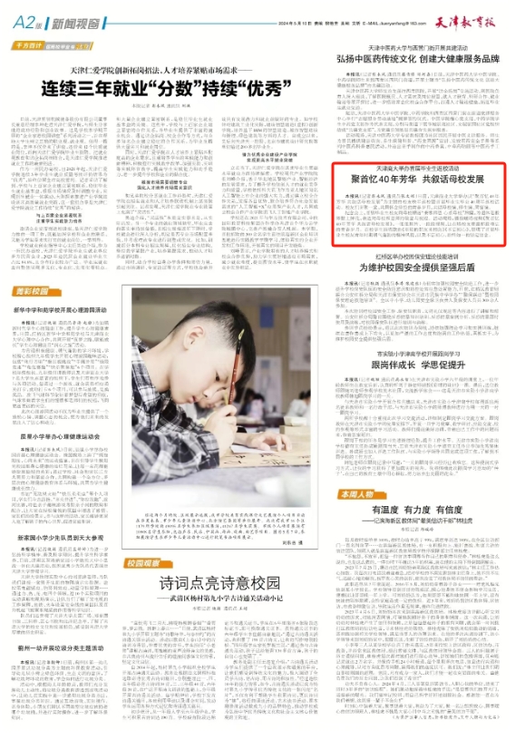5月10日,《天津教育報(bào)》報(bào)道學(xué)校舉辦校友秩年返校暨首屆畢業(yè)生畢業(yè)40周年返校活動(dòng)。