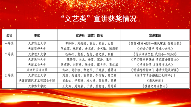 比賽現場,宣講員們或娓娓道來,或慷慨激昂,聚焦主題主線、結合自身實際,把黨的創新理論宣講融入學習工作生活實踐。有的圍繞習近平總書記視察天津重要講話精神進行宣講,積極踐行四個“善作善成”重要要求;有的解讀京津冀協同發展戰略,奮力譜寫中國式現代化天津新篇章;有的闡述天津百年歷史,激發津門學子熱愛天津、建設天津、扎根天津;有的用“朗誦+合唱”的形式,再現建黨百年來涌現的先進模范人物代表;有的以“青馬學員”的視角,講述新時代好青年如何推動文化傳承發展;有的則結合支教經歷,引導大家鑄牢中華民族共同體意識……宣講員們用小切口反映大時代,小故事講述大道理,小視角折射大主題,用“互動式”“情境式”等表現形式,展現了教育系統廣大黨員干部師生聽黨話、跟黨走的理想信念,牢記囑托、勇擔使命、開拓進取的精神風貌。
