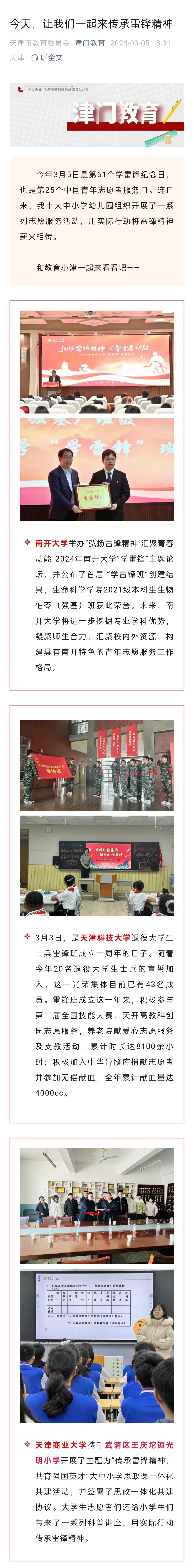 3月5日,津門教育微信公眾號報道學校開展學雷鋒志愿服務活動。天津商業大學攜手武清區王慶坨鎮光明小學開展了主題為“傳承雷鋒精神,共育強國英才”大中小學思政課一體化共建活動,并簽署了思政一體化共建協議。大學生志愿者們還給小學生們帶來了一系列科普講座,用實際行動傳承雷鋒精神。