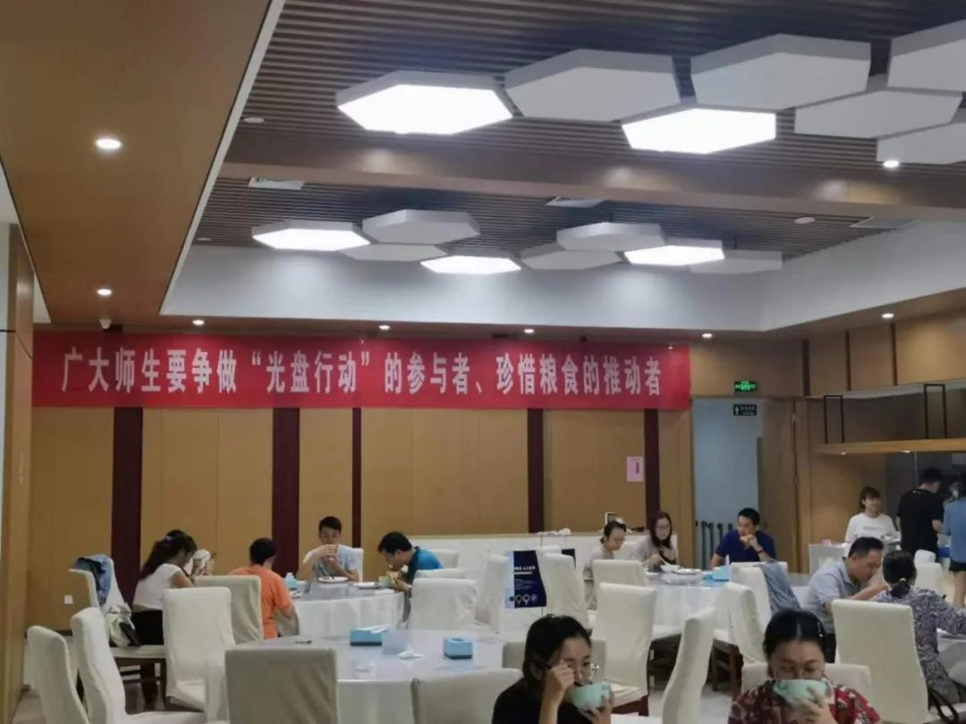 張掛一批“堅決制止餐飲浪費行為 切實培養節約習慣”“厲行節約 反對浪費 事在全民 人人有責”等主題標語;辦公樓、教學樓等重點場所電子顯示屏滾動播放相關標語口號;食堂入口處擺放倡議書,大廳懸掛標語口號、張貼宣傳畫,餐桌放置提示牌宣傳畫、餐位貼等,形成強大輿論聲勢,在全校營造浪費可恥、節約為榮的濃厚氛圍。