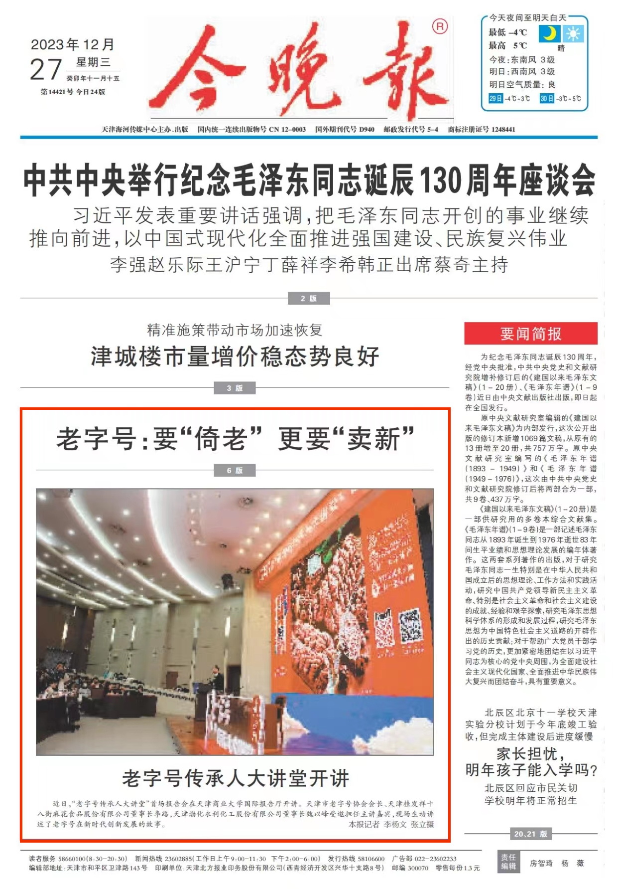 12月27日,《今晚報》頭版大圖報道學校舉辦“老字號傳承人大講堂”首場報告會。