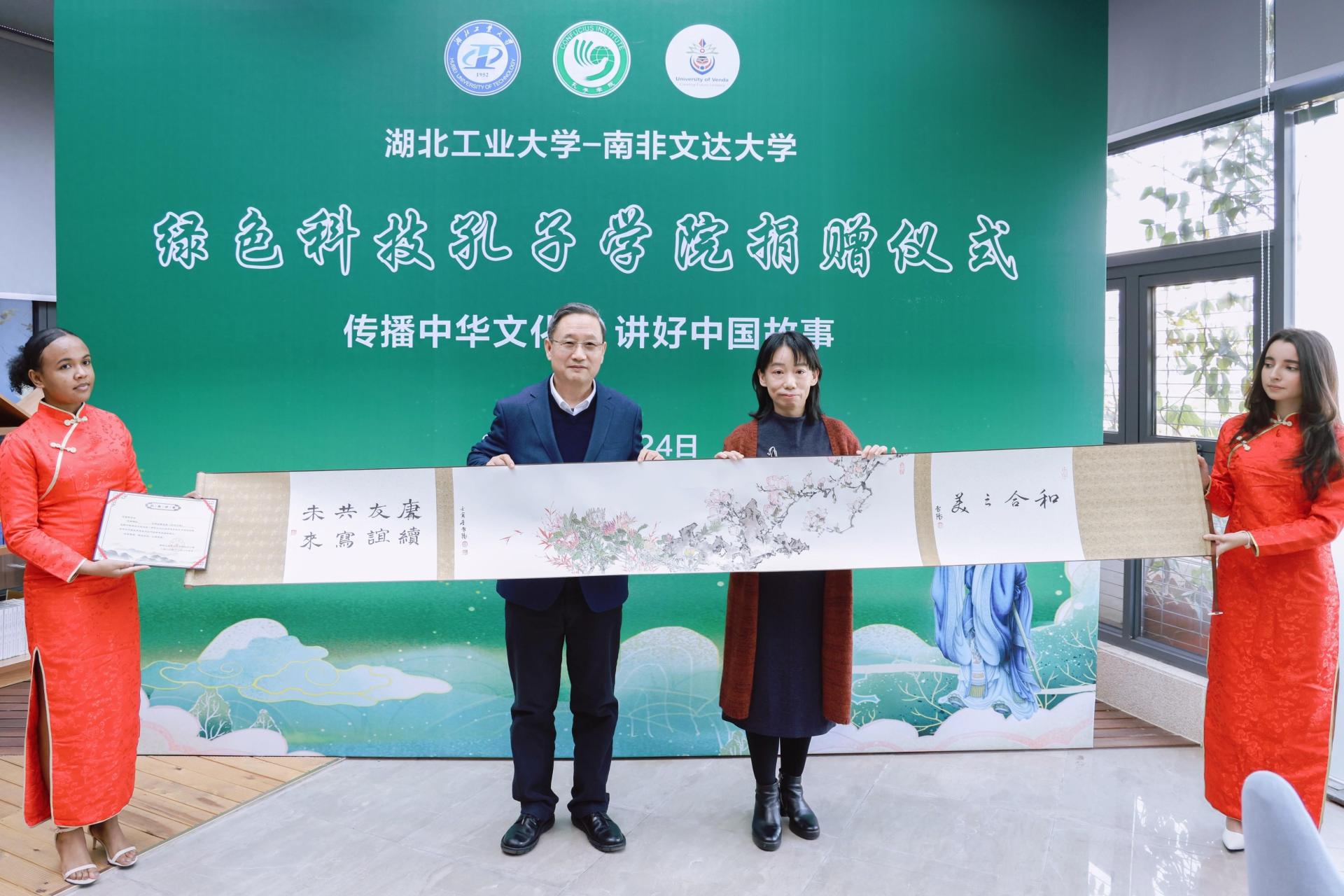 11月24日,湖北工業大學-南非文達大學綠色科技孔子學院中國傳統文化作品捐贈儀式,在湖北工業大學行政樓舉行。湖北工業大學黨委書記彭育園出席捐贈儀式并致答謝辭。著名女畫家莊雪陽受邀出席活動,并捐贈中國畫長卷《和合之美》。