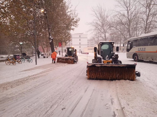 據了解,天津商業大學后勤直屬黨支部帶領后勤職工、校園物業,堅持“機械為主、人工為輔”原則,遲續奮戰27小時,分區域搶抓作業時間,使用鏟車機械設備對校園主干路進行疏通,采用“先主后次、先通后清”的作業方式,積極安排部署道路清雪工作。其中,共出動鏟車4輛、一線清雪人員百余人次,融雪劑48余噸,除雪鏟500余把。