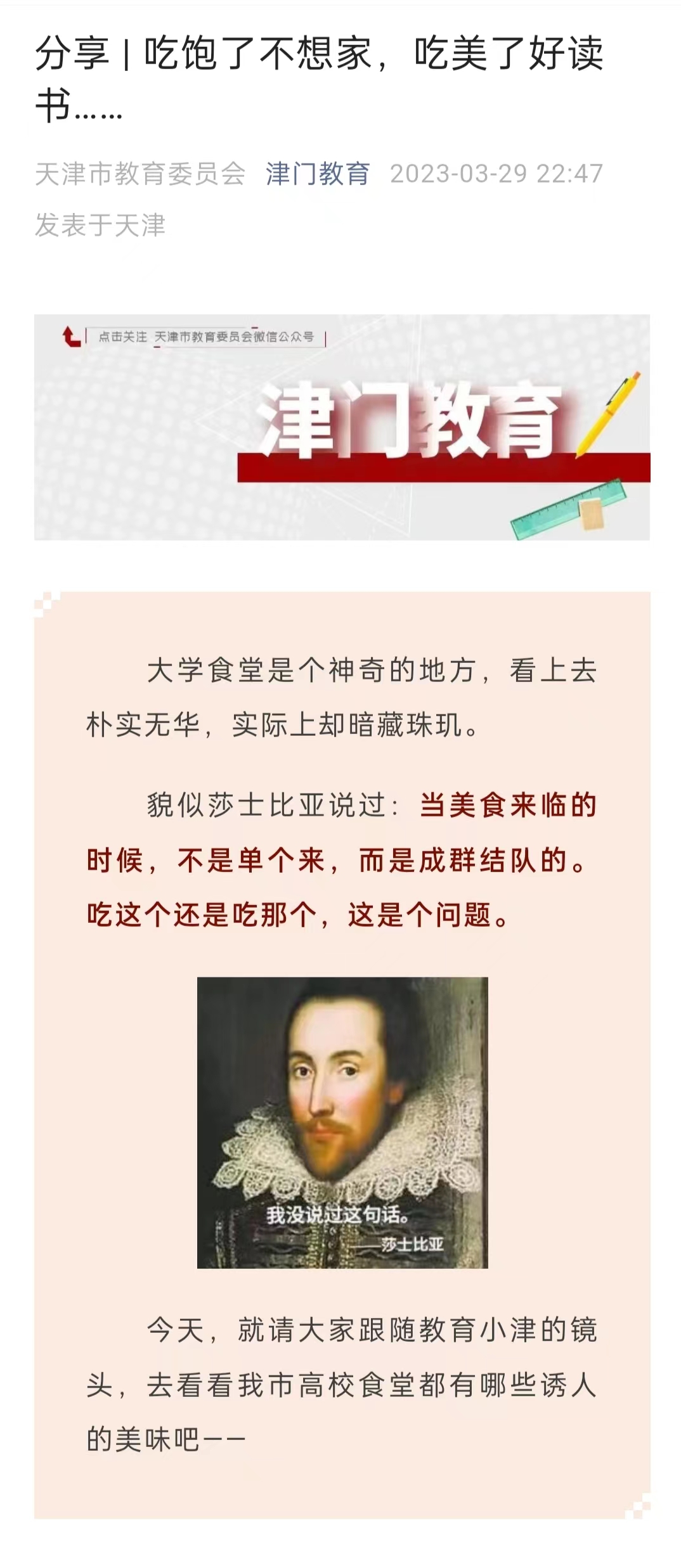 3月29日,市教委微信公眾號“津門教育”以“分享 | 吃飽了不想家,吃美了好讀書……”報道學校食堂特色餐飲。